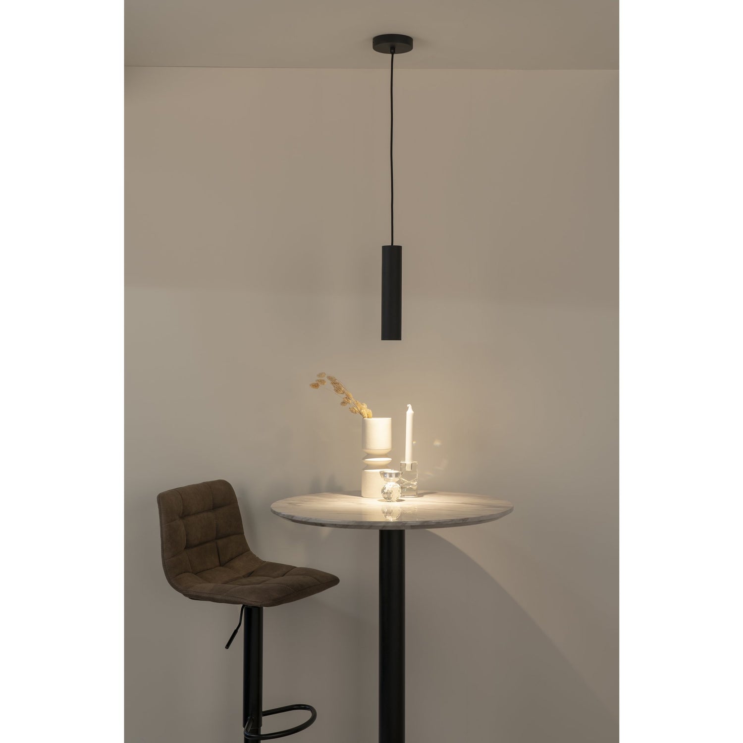 Schöne minimalistische Deckenleuchte aus schwarzem Stahl mit 120cm Stoffkabel. Kaufen Sie ein einzelnes oder mehrere Stücke und hängen Sie sie in verschiedenen Längen auf.