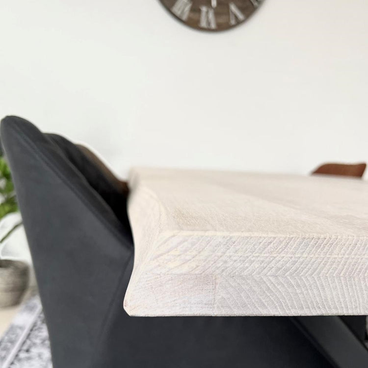 Wenn Sie einen Esstisch suchen, der sich perfekt in Ihren Einrichtungsstil integriert, dann ist unser weiß geölter Venus Esstisch genau das richtige für Sie. Dieser Esstisch überzeugt durch seinen schlichten Look. Das Zusammenspiel zwischen der hellen Massivholzplatte und den dunklen pulverbeschichteten Tischbeinen verleiht dem Esstisch eine angenehme Harmonie.